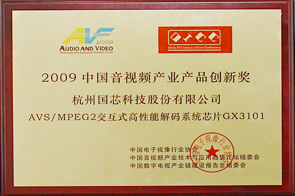 On Dec. 4th, 2009, GX3101, AVS/MPEG2 decoder of NationalChip was honored the AV Product Innovation Awards on the conference of 5th AVF and DICC in Beijing. Mr. Lin Yuanfang from China video industry association, and Mr. Li Jian, engineer director of China digital TV customer end laboratory issued the awards to NaitonalChip.