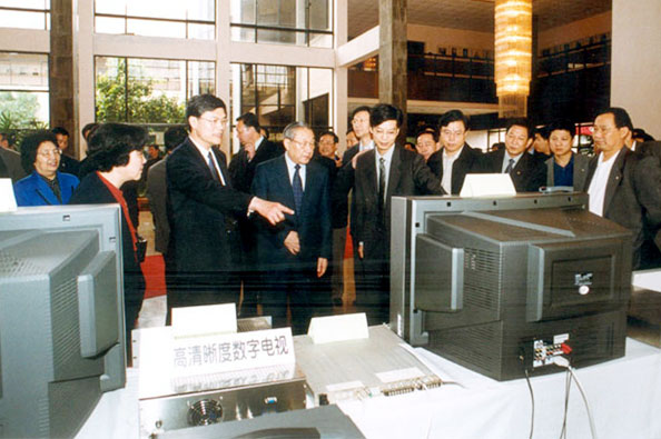 在玉泉校区邵逸夫科学馆,李岚清副总理兴致勃勃地观看了由浙江大学信电系主任王匡教授主导研发的高清晰度数字电视传输系统。仔细听取了系统介绍后,李岚清副总理勉励浙大的学科带头人,要在现有基础上,不断增创新优势,努力更上一层楼。