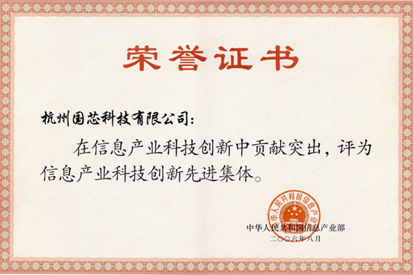 杭州国芯科技股份有限公司被评为信息产业科技创新先进集体,公司董事长兼总经理王匡教授和系统开发部经理邹志永博士被评为信息产业科技创新先进工作者。