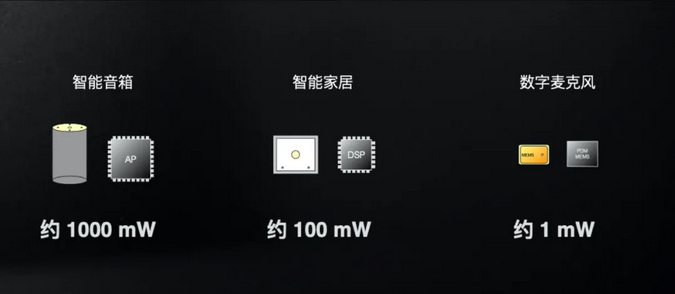 对比过去用于智能音箱的传统智能语音芯片,其功耗为 1000mW;集成 DSP 的智能家居芯片,其功耗为 100mW;而即便是最小单元的数字麦克风,功耗也要 1mW。